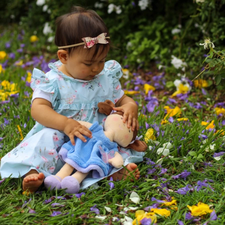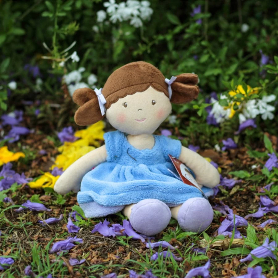 Brunette Pari in her bright blue plush dress. Super soft and fantastic for little ones to cuddle.