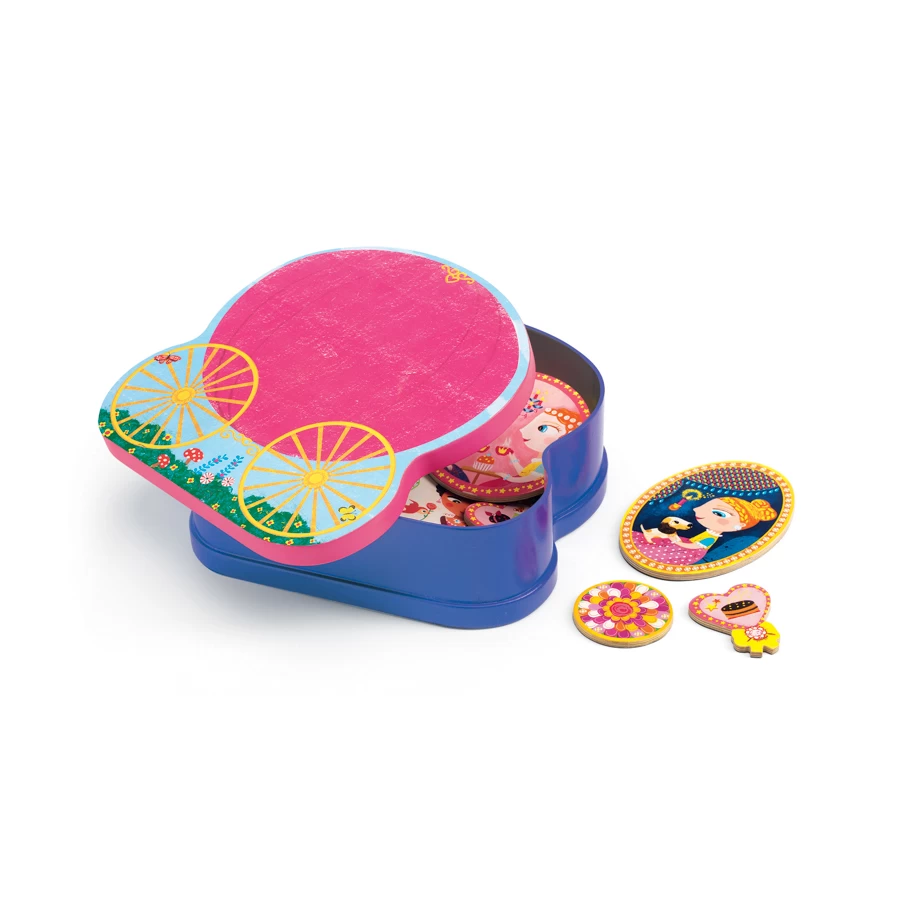 The beautiful princesses are dressed and ready for the ball. Decorate the princess carriage with this set of magnetic pieces. Includes a metal ‘carriage-shaped’ box and magnetic bows, hearts and stars. Stick the magnets to your fridge or use the compact metal box, for a fun and entertaining activity.