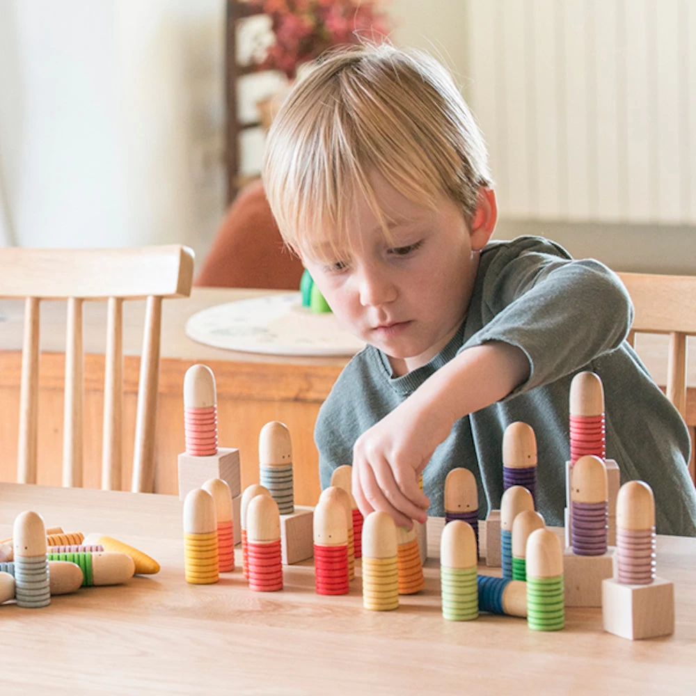 The Grapat set of 18 Brots®  are handcrafted from solid wood, featuring 6 colours each in 3 varying shades. These beautiful open ended wooden pieces are a lovely variation on the classic peg doll. Made with love and sustainable materials, they form the basis of so many aspects of play, from imaginative and small world play, to story-telling, and to learning through play in counting and sorting. Their simple and unstructured form allow children to imagine the expression, gender and roles supporting their own emotional development and understanding of the world and people around them.