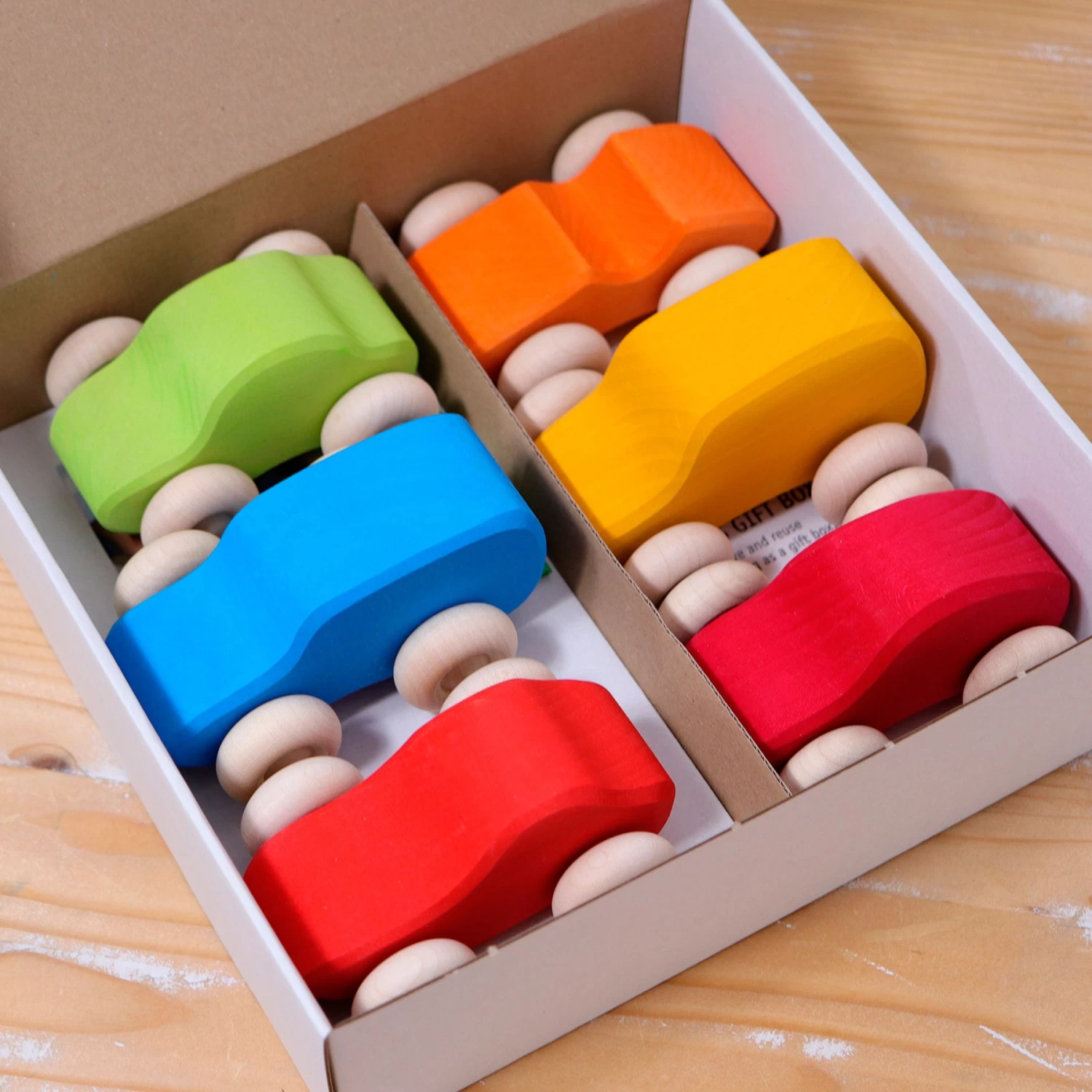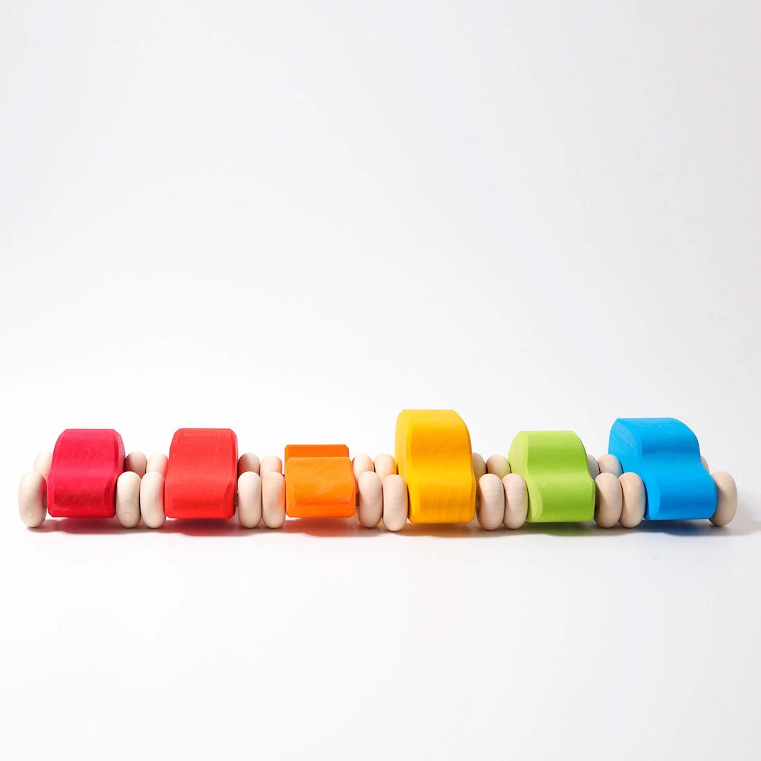 Set of 6 colourful wooden cars by Grimm’s finished in various colours.