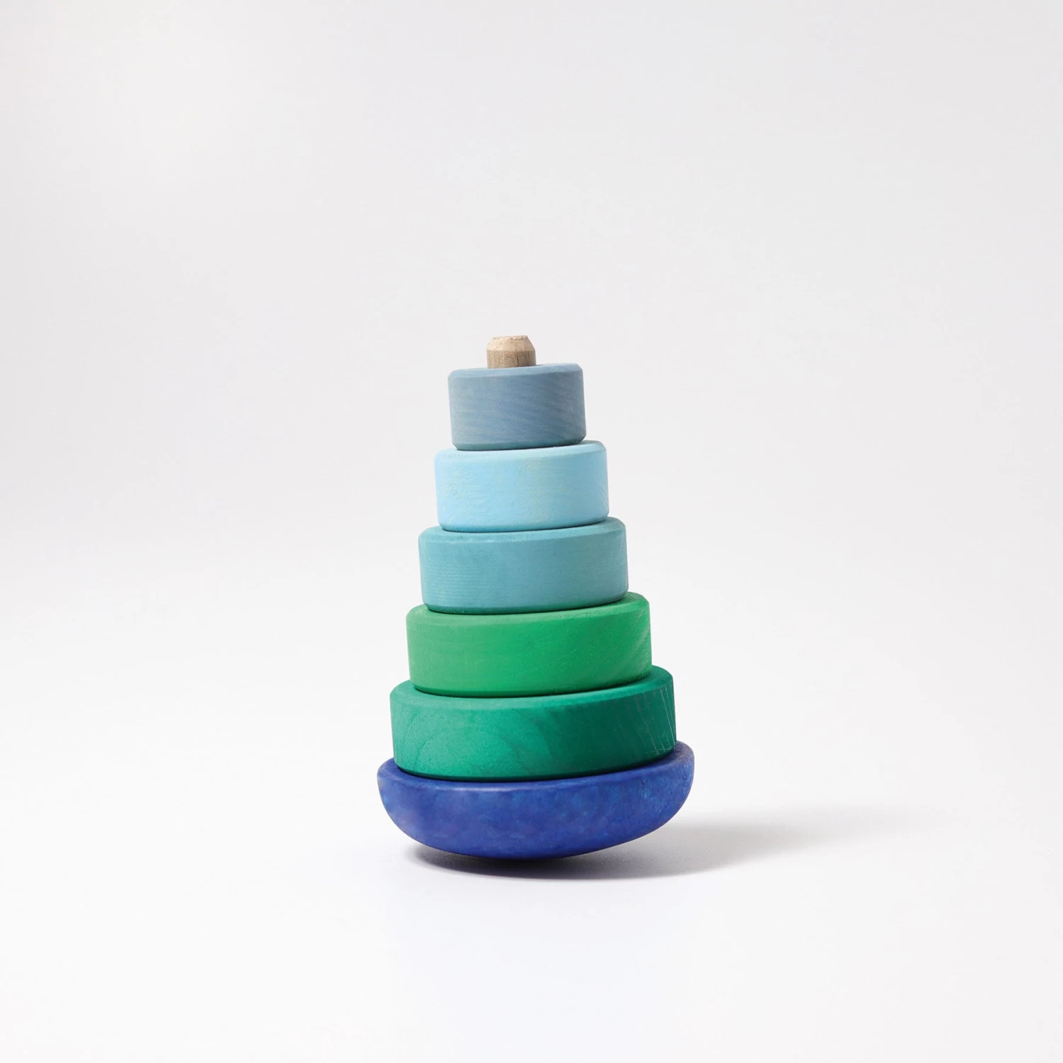This Grimm’s small wobbly wooden stacking tower, with 5 coloured discs in shades of blue, allows children to stack and build, assisting in the development of hand-eye coordination and fine motor skills. The wobble adds to fun. These blocks can be used on and off the central pole so that children can use them for building, sorting and imaginary play.