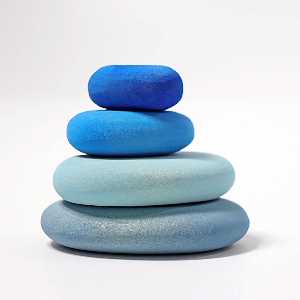 The River Pebble set contains 4 smooth wooden pieces in shades of blue.
