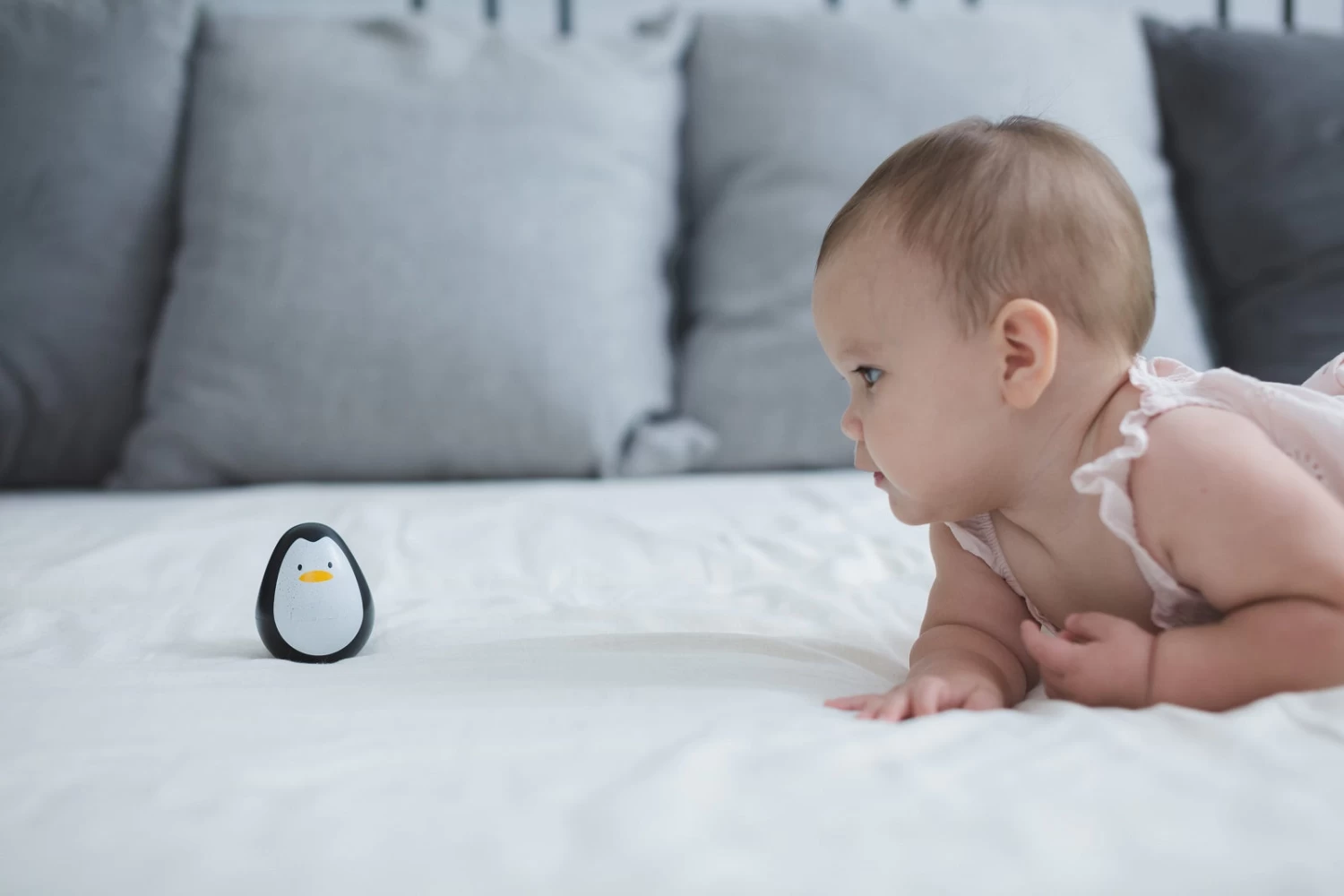 Push the penguin gently and watch it tumble. This item encourages visual development for babies.