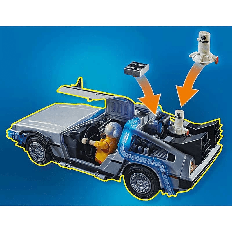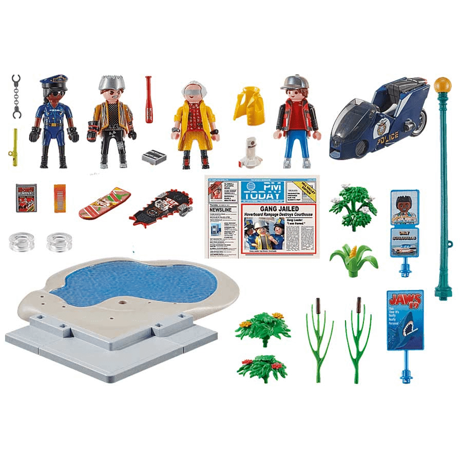 Based on the iconic film series, the Hoverboard Chase Scene playset features Marty Mcfly on his hoverboard and Biff chasing the Almanac. Dr Emmett Brown is also included with interchaganble jackets, and additional accessories for the DeLorean (sold separately)